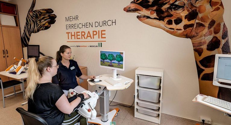 Hier bieten wir mit Geräten von Tyromotion modernste Robotik- und computergestützte Therapiegeräte, an denen Sie eine Vielzahl von Übungen insbesondere zur Therapie von Finger, Hand, Arm und Schulter absolvieren.